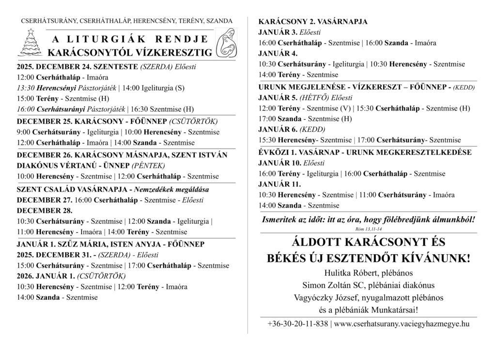 Plébániai hirdetésekÜnnepekKarácsonyi liturgikus rend – 2025. Simon Zoltán SC4 nap ezelőtt2 óra ezelőtt01 perc A további egyházközségi eseményeket és liturgikus rendet ITT OLVASHATJÁK! Bejegyzés navigáció Előző: Üzenet karácsonyraKövetkező: Simon Zoltán SC diakónus nyílt levele a cserhátsurányiaknak, a rágalmazóknak és minden jószándékú embernek a béke jegyében – 2025. december 17.