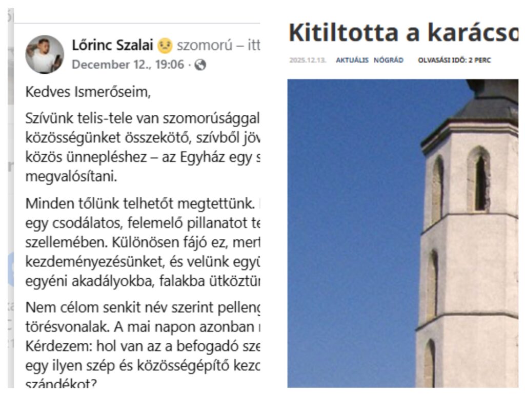 A Palóc Hírnök portál, Hegedűs Henrik 1. bejegyzése: https://palochirnok.hu/2025/12/13/kitiltotta-a-karacsonyi-koncertet-a-templombol-a-cserhatsuranyi-plebanos/